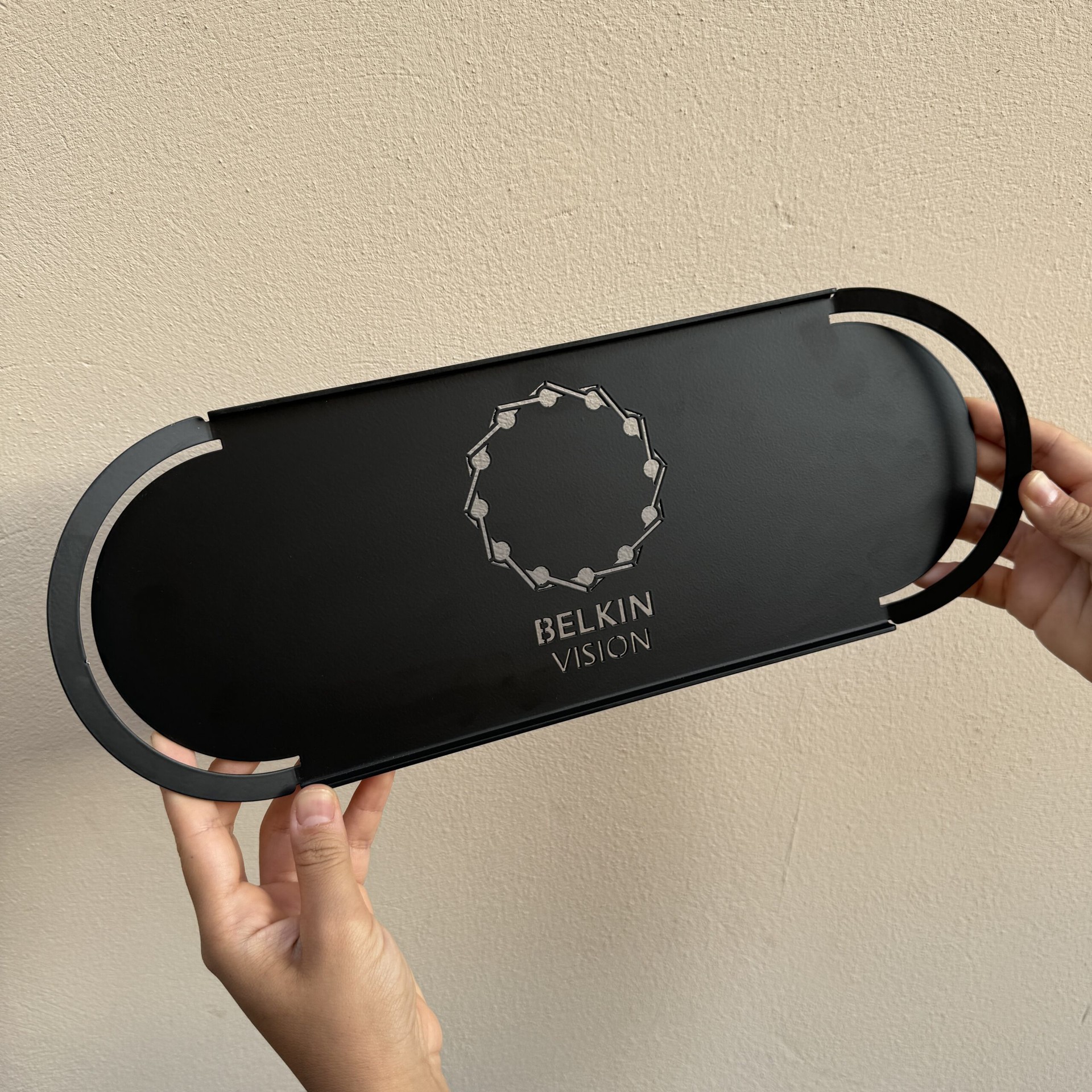 עבור BELKIN VISION, יצרנו מגש ממותג ממתכת איכותית, המשלב עיצוב אלגנטי ופונקציונליות. המגש מעוטר בלוגו החברה ובסלוגן “BELKIN VISION”, המוטבעים בחיתוך לייזר מדויק. המגש הממותג משמש כמתנה יוקרתית לעובדים, ומחזק את המותג של BELKIN VISION. העיצוב המינימליסטי והגימור המוקפד הופכים את המגש לפריט שימושי ומרשים, המשדרג כל שולחן או משרד.