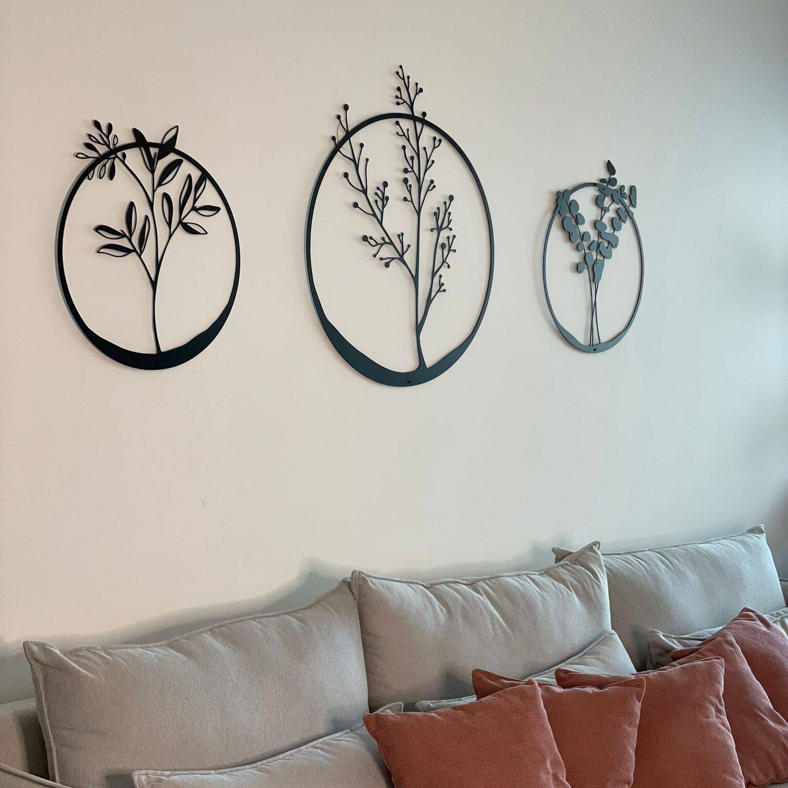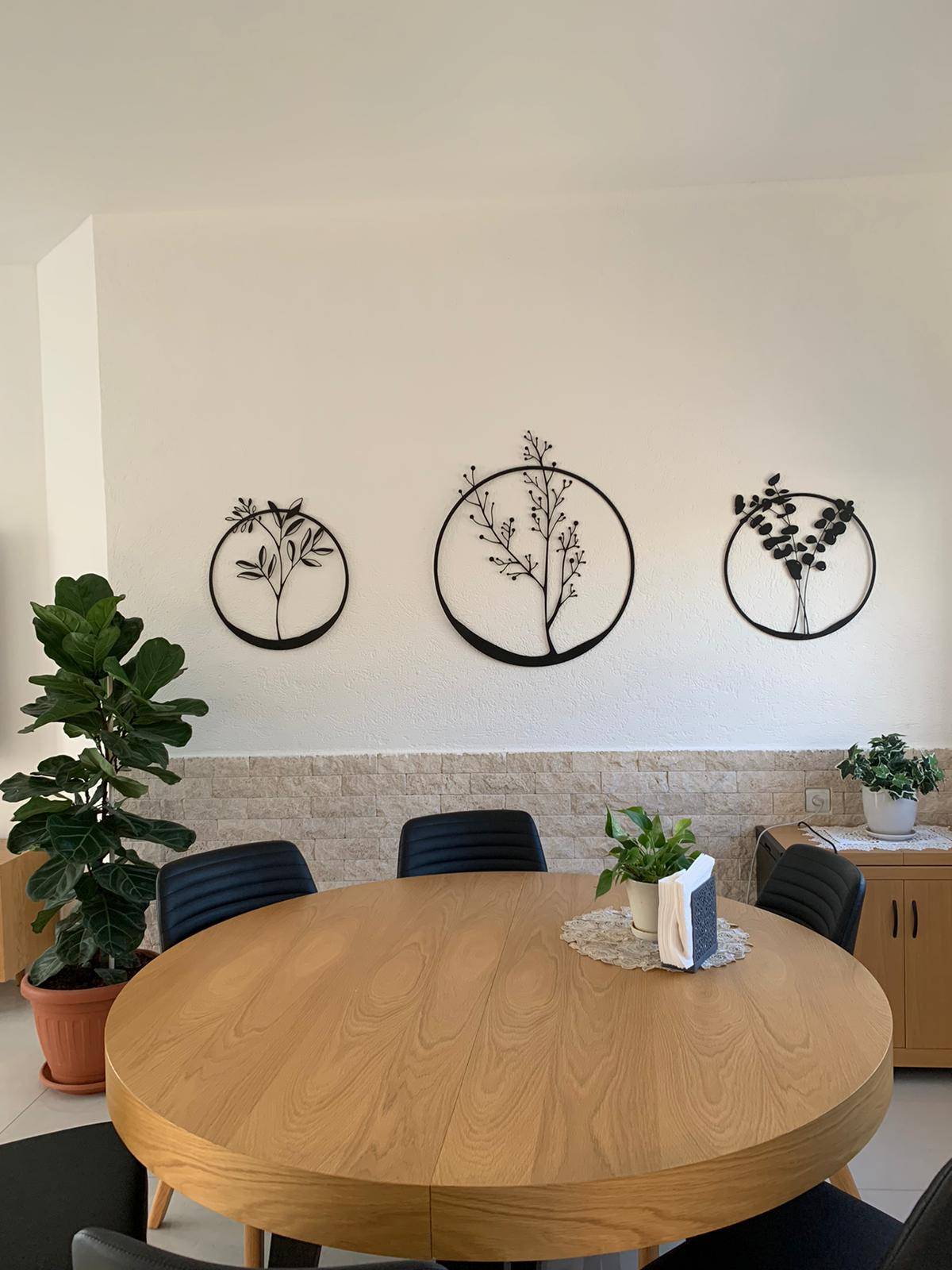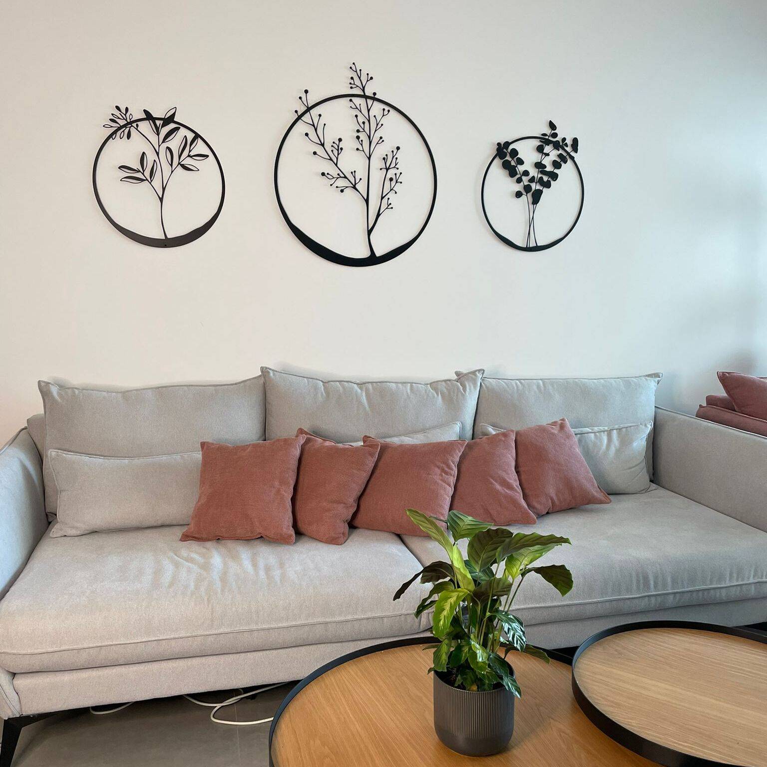 עיצוב רך ומדויק, המתאר את עלי האקליפטוס, פרחי הבר ועלי הזית מלבלבים וחוצים את גבולות המסגרת העגולה.