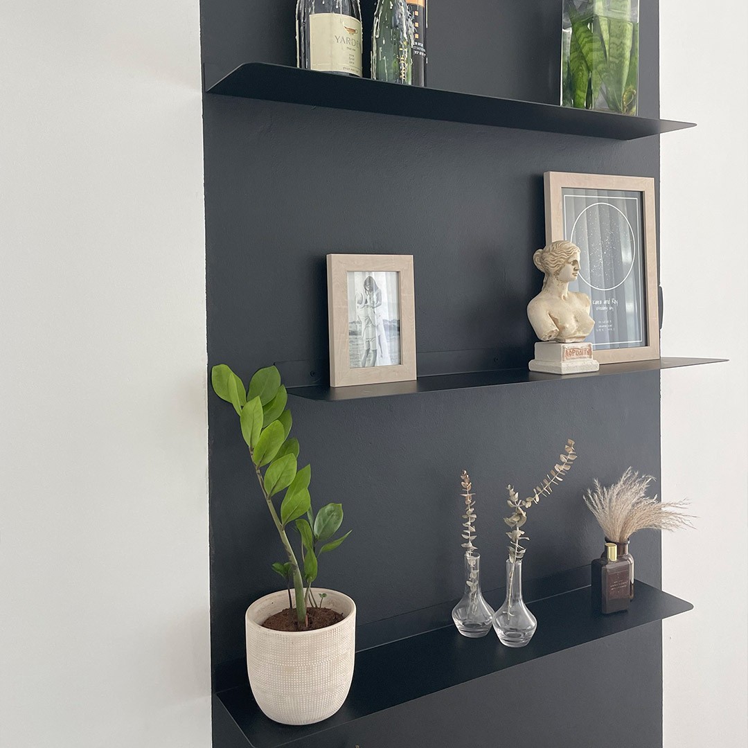 המדף "צף" על הקיר ומאפשר תצוגה של פריטים אהובים בלי להעמיס על העיצוב.