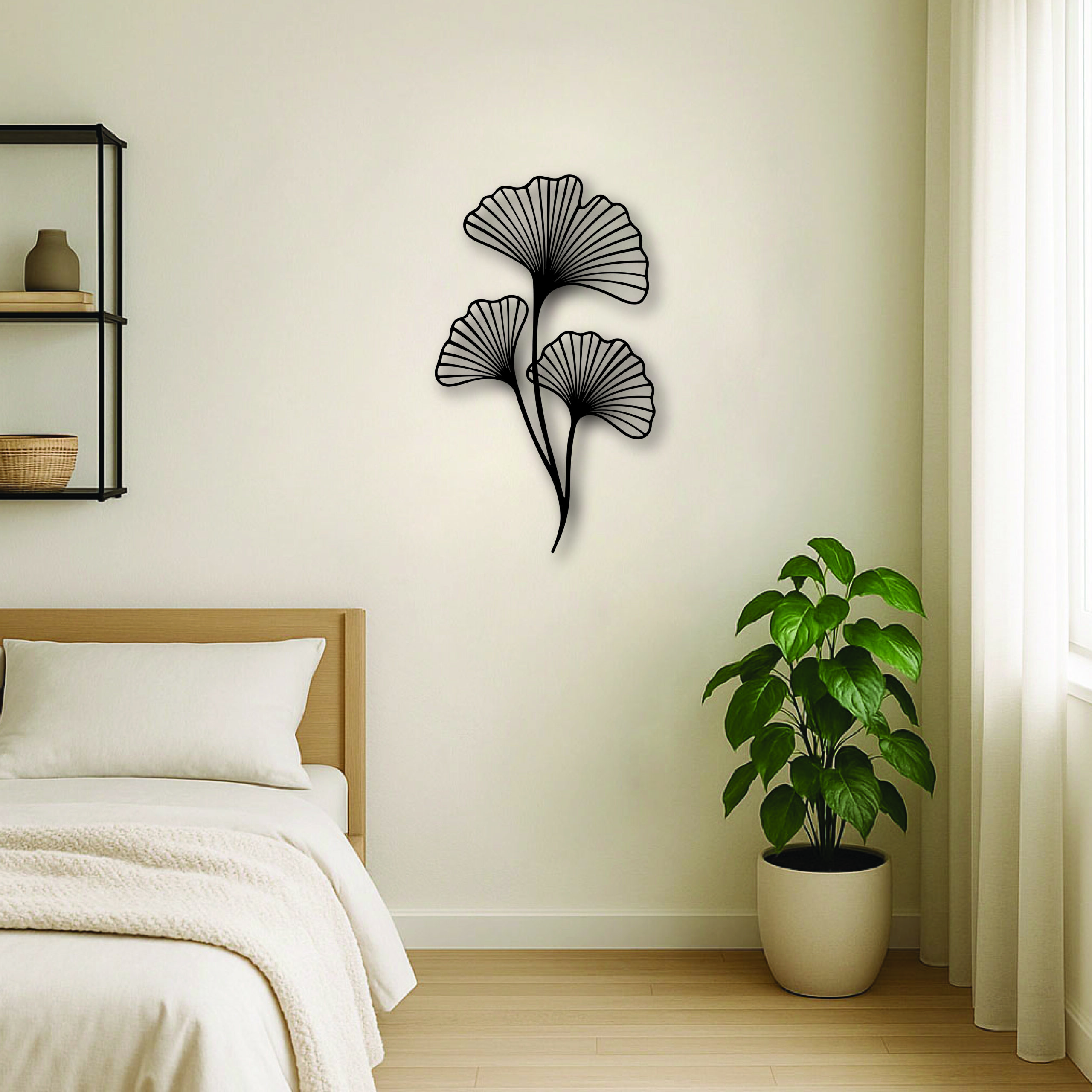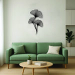 יצירת מתכת עדינה בעיצוב של שלישיית עלי גינקו, המסמלים איזון, הארה וחיבור לטבע.