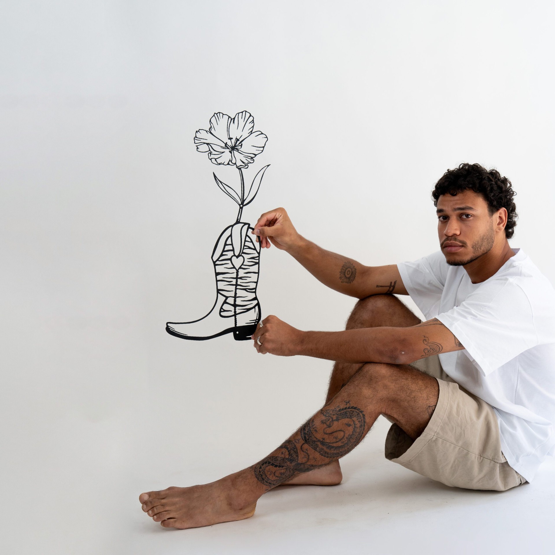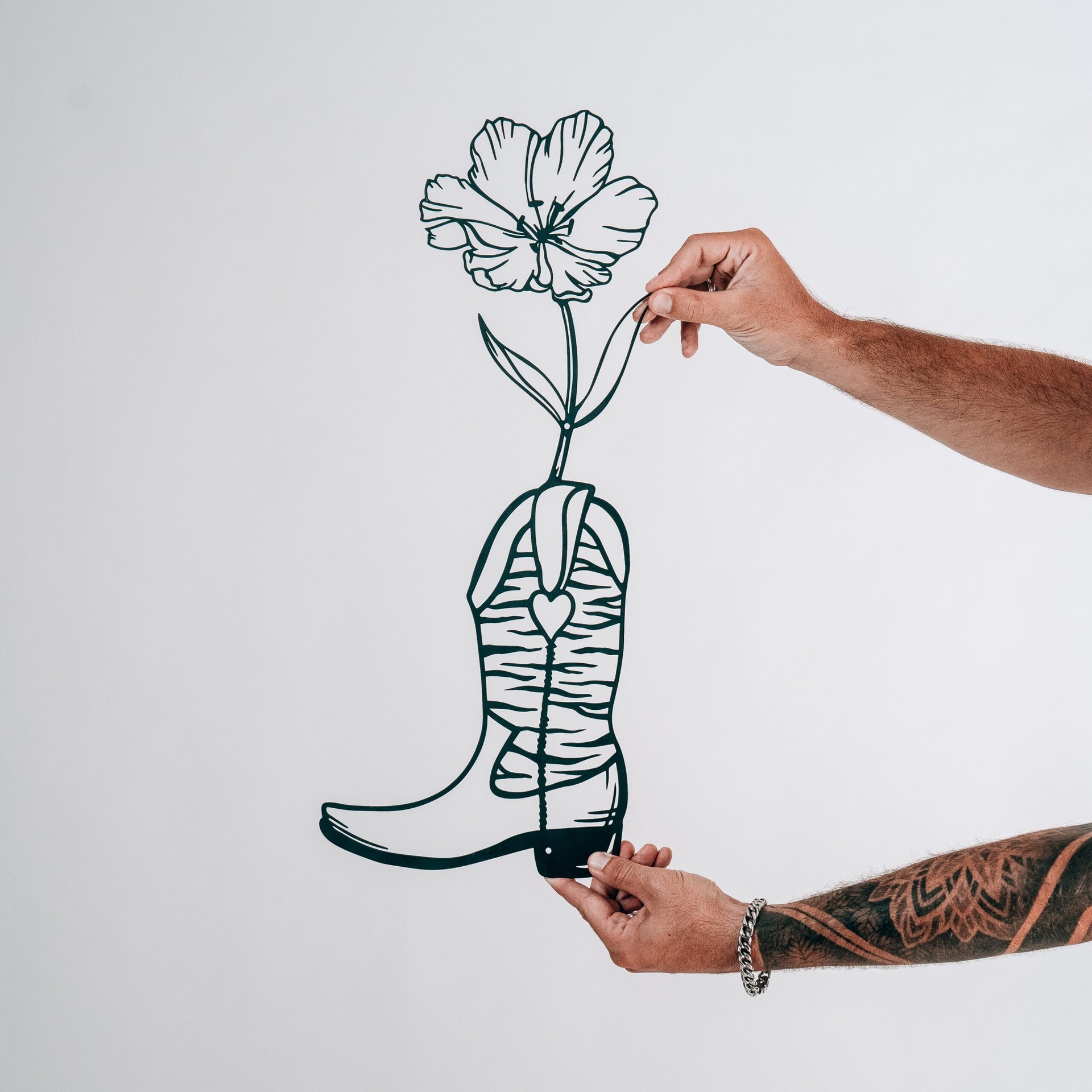 יצירת אמנות קיר זו, COW GIRL, היא מחווה עדינה ועוצמתית לרוח החופשית והעצמאית של נשות המערב הפרוע. מגף בוקרת קלאסי, סמל לכוח, הרפתקנות ועמידות, הופך לאגרטל בלתי צפוי, ממנו פורח פרח עדין ויפהפה.