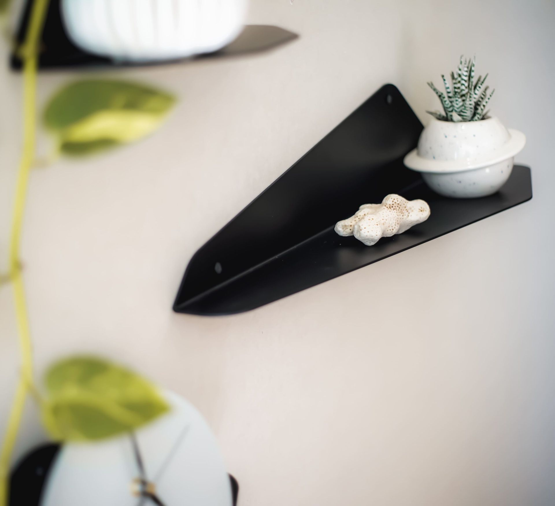 מדפי נוי ממתכת לתלייה על הקיר בצבע שחור מט.