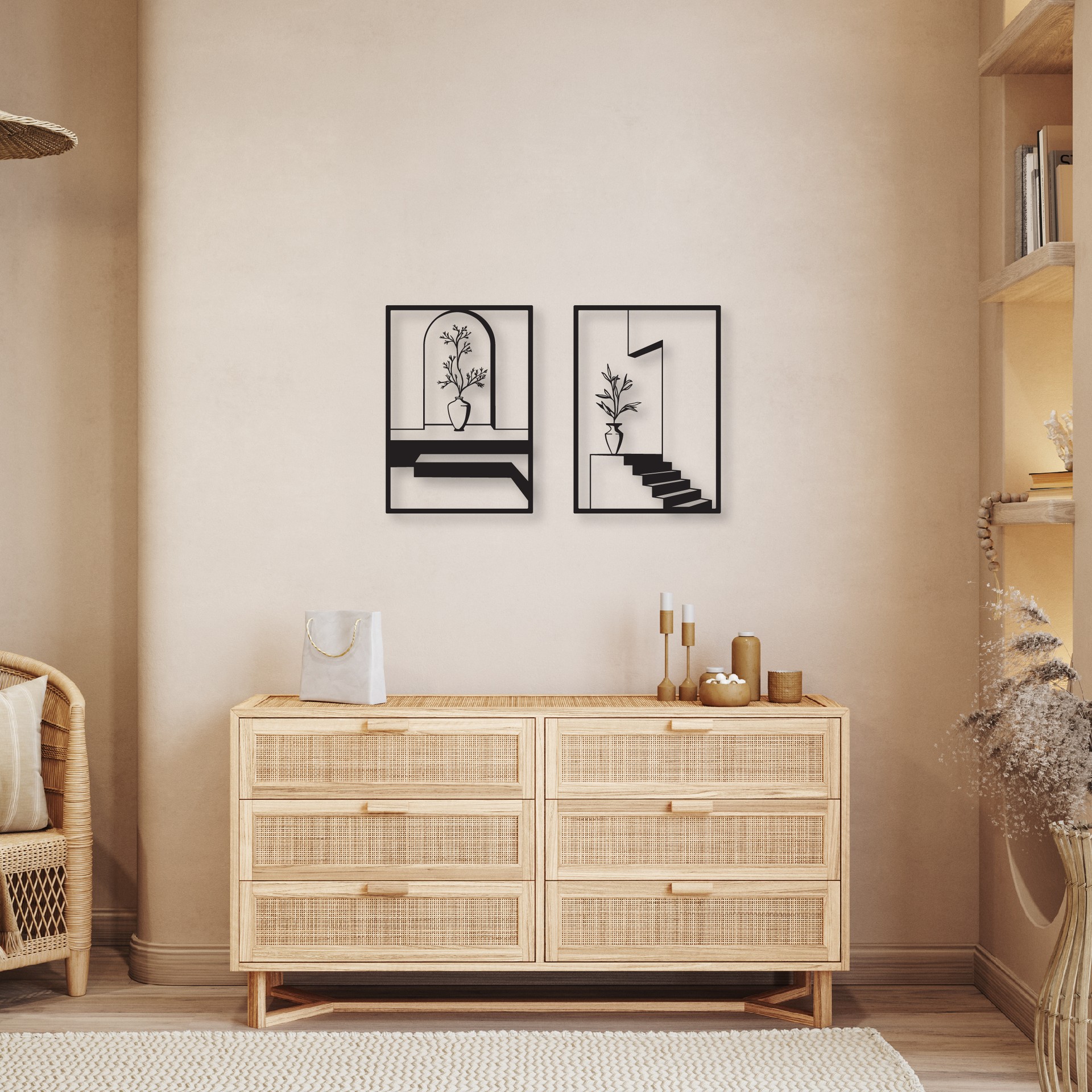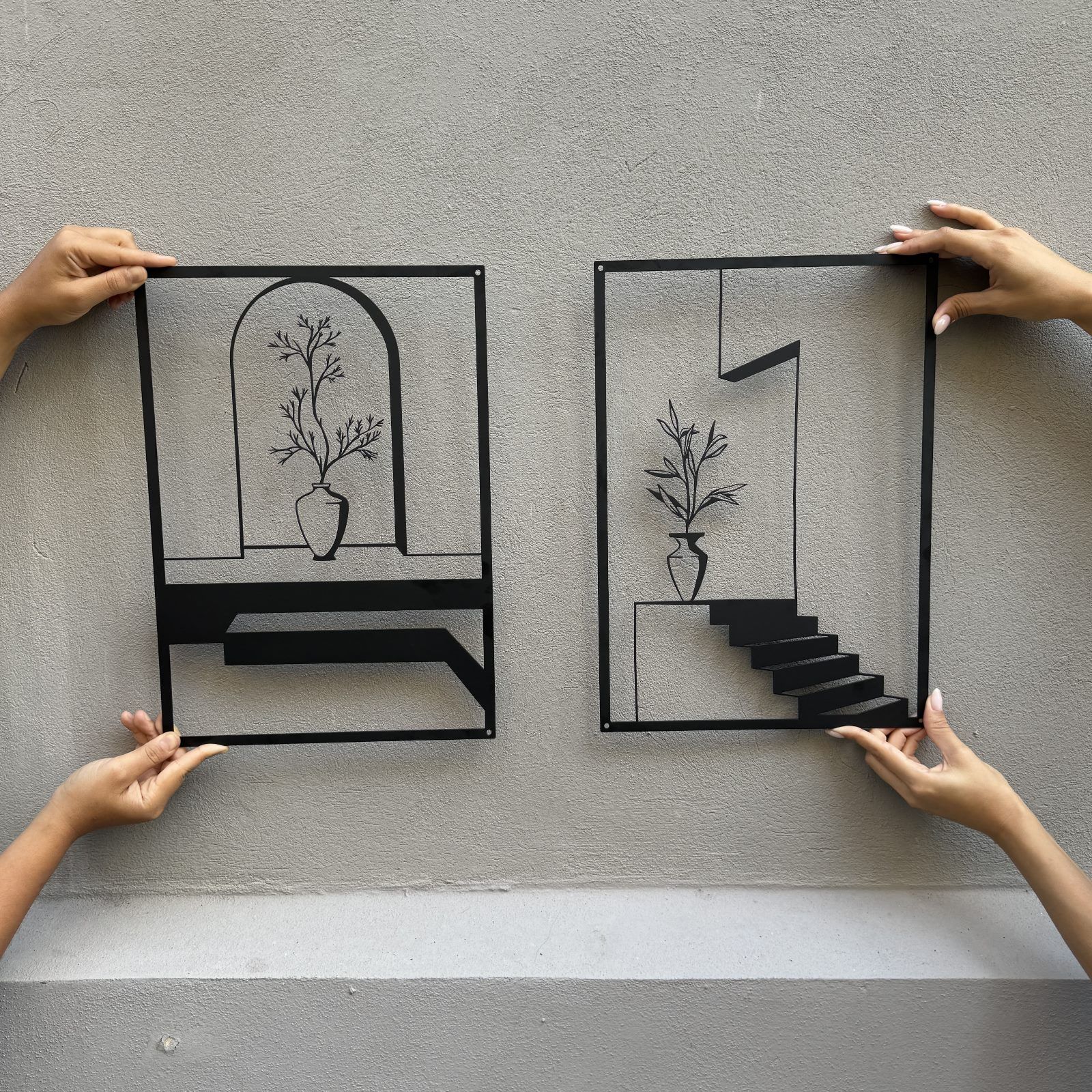 זוג תמונות מתכת לקיר מעוצבות בקווים נקיים וזוויות חדות היוצרת אשליה של עומק ותנועה,