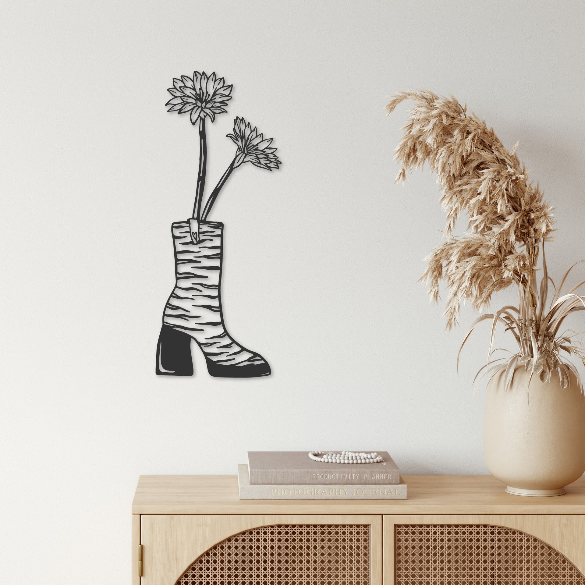 יצירת אמנות קיר נועזת זו, ZEBRA BOOT, היא שילוב מפתיע ומרענן בין עולמות שונים. מגף בעיצוב זברה פראי ועוצמתי, הופך לאגרטל בלתי צפוי, ממנו פורצים פרחים עדינים ויפים.